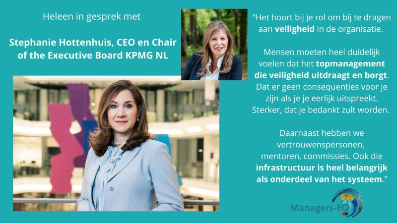 In mijn recente gesprek voor de nieuwe MEQ-interviewreeks met Stephanie Hottenhuis, CEO en Chair of the Executive Board KPMG NL, kwam dit thema naar voren. Het viel me op dat zij veiligheid zowel betrekt op het leiderschap als op de organisatiecontext. Beide aspecten zijn wezenlijk om veiligheid in de organisatie te kunnen borgen.